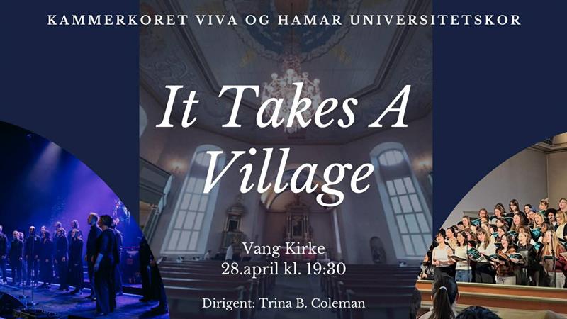 Kammerkoret Viva og musikkstudentene ved Universitetet i Innlandet i Hamar inviterer til felleskonsert i Vang kirke 28. april med tittelen «It Takes a Village». Publikum får møte to kor med ulik bakgrunn i et variert program som viser bredden i kortradisjon og musikalsk samarbeid i Hamar.