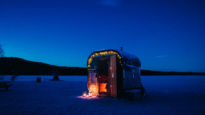 Badstua er fyrt opp til behagelig temperatur, med mulighet for isbad for økt sirkulasjon og velvære.