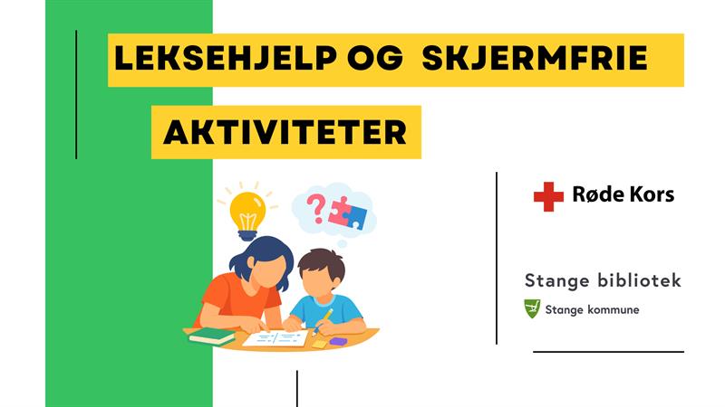 Hver tirsdag etter skoletid har vi skjermfritt tilbud på biblioteket. Frivillige fra Røde kors stiller med leksehjelp for barneskoleelever, og ellers andre skjermfrie aktiviteter (tegning, brettspill mm.).