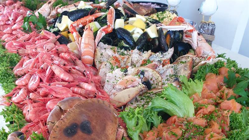 På menyen står bla. fiskesuppe, hvitvinsdampede blåskjell, reker, taskekrabbe, røkelaks og sild med tilbehør.